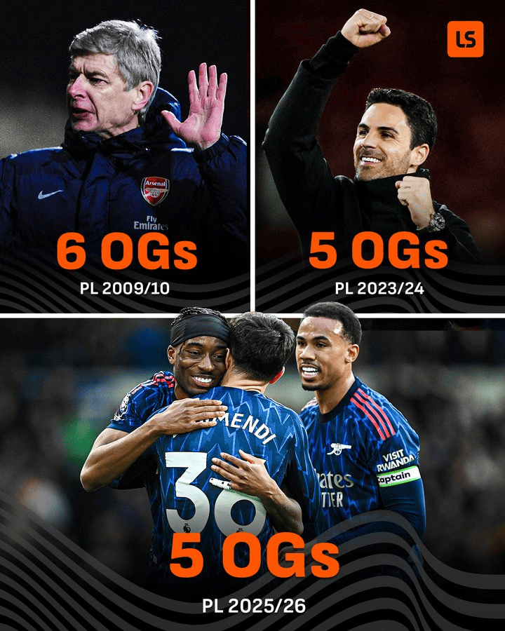 值得一提的是,队史纪录赛季发生在温格执教时期;而2023/24的“5乌龙”和如今的“5乌龙”,则都出现在阿尔特塔治下。
